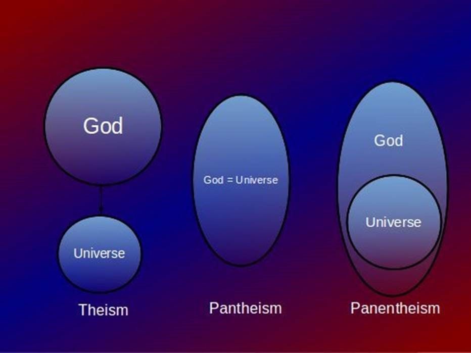 [*Panentheism considers God and the world to be inter-related, with the world being in God and God being in the world. It affirms both divine transcendence and immanence—unlike pantheism, which equates God with the world, or classical theism, which emphasizes their separateness. So, God is present throughout the universe, affecting and being affected by it. Although panentheism appears third in the illustration below, it is actually considered the ‘middle ground’ between two extremes—theism and pantheism—because it recognizes both God’s presence in the world (immanence) and His otherworldly majesty (transcendence). – See the picture here.]